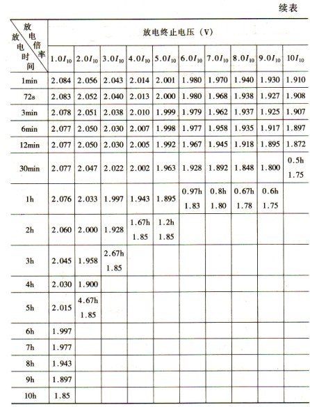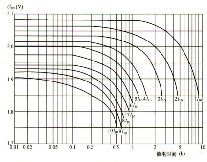 圖4—4閥控電池的放電特性曲線為增長新粒子的結(jié)晶中心,以提高充電電流的效率。 5,10~10110放電曲線比1,10~4,l0放電初期端電壓和中期端電壓變化速率變化大,其原因是高放電率下的放電電流很大,電池極化作用隨電流增加而變大。 閥控電池不同倍數(shù)率的放電特性見表4—4。表4—4 閥控電池不同倍率的放電特性曲線表(25℃)