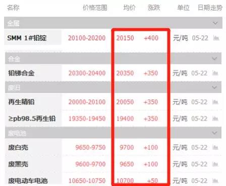 5月22日 周二 鉛價漲400元/噸均價20150 元/噸